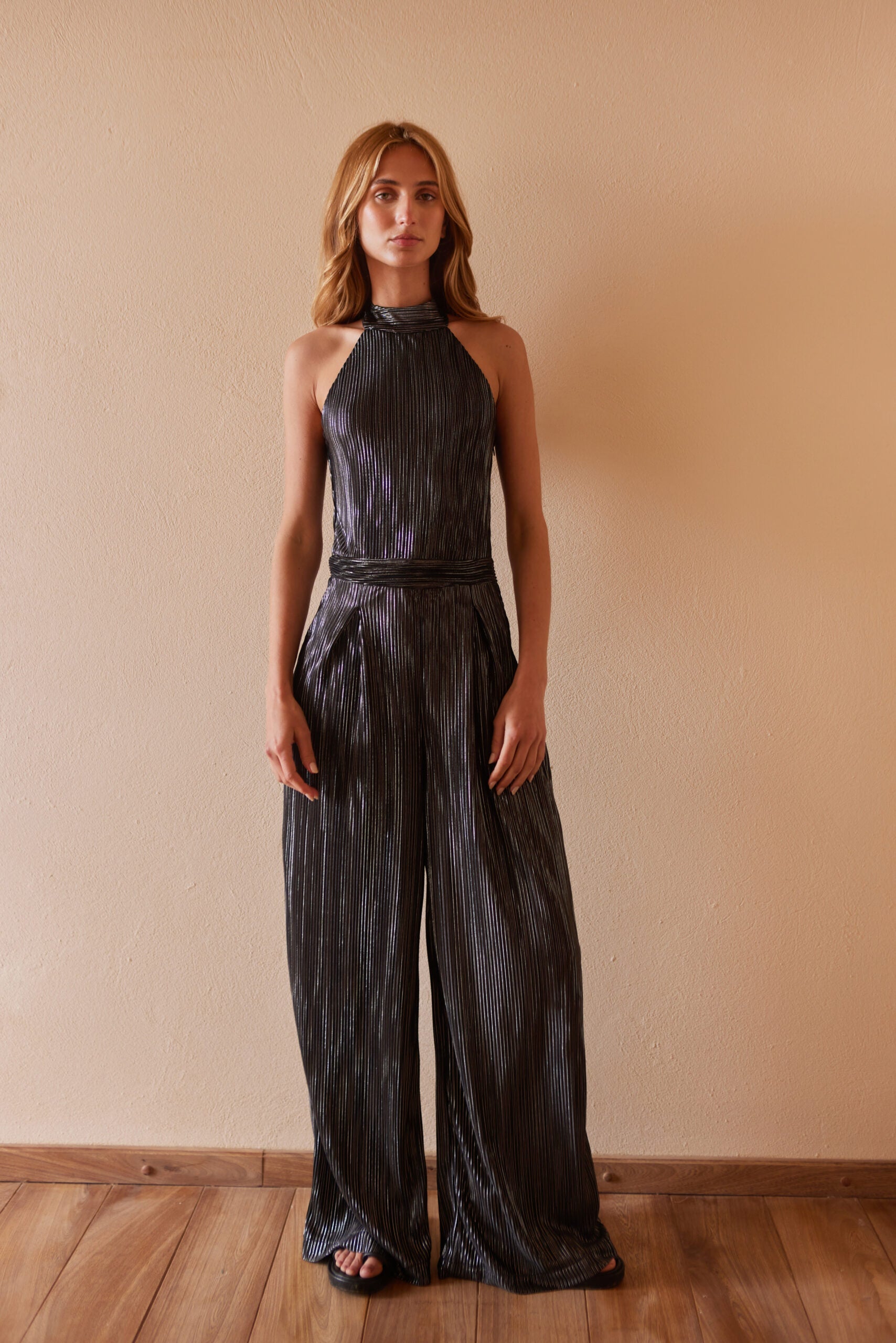 Halterneck sparkly jumpsuit, fitted at the top and draping at the bottom. Perfect for a night out or cocktail party. Wear it with high heels and sparkly accessories to really enhance your look.