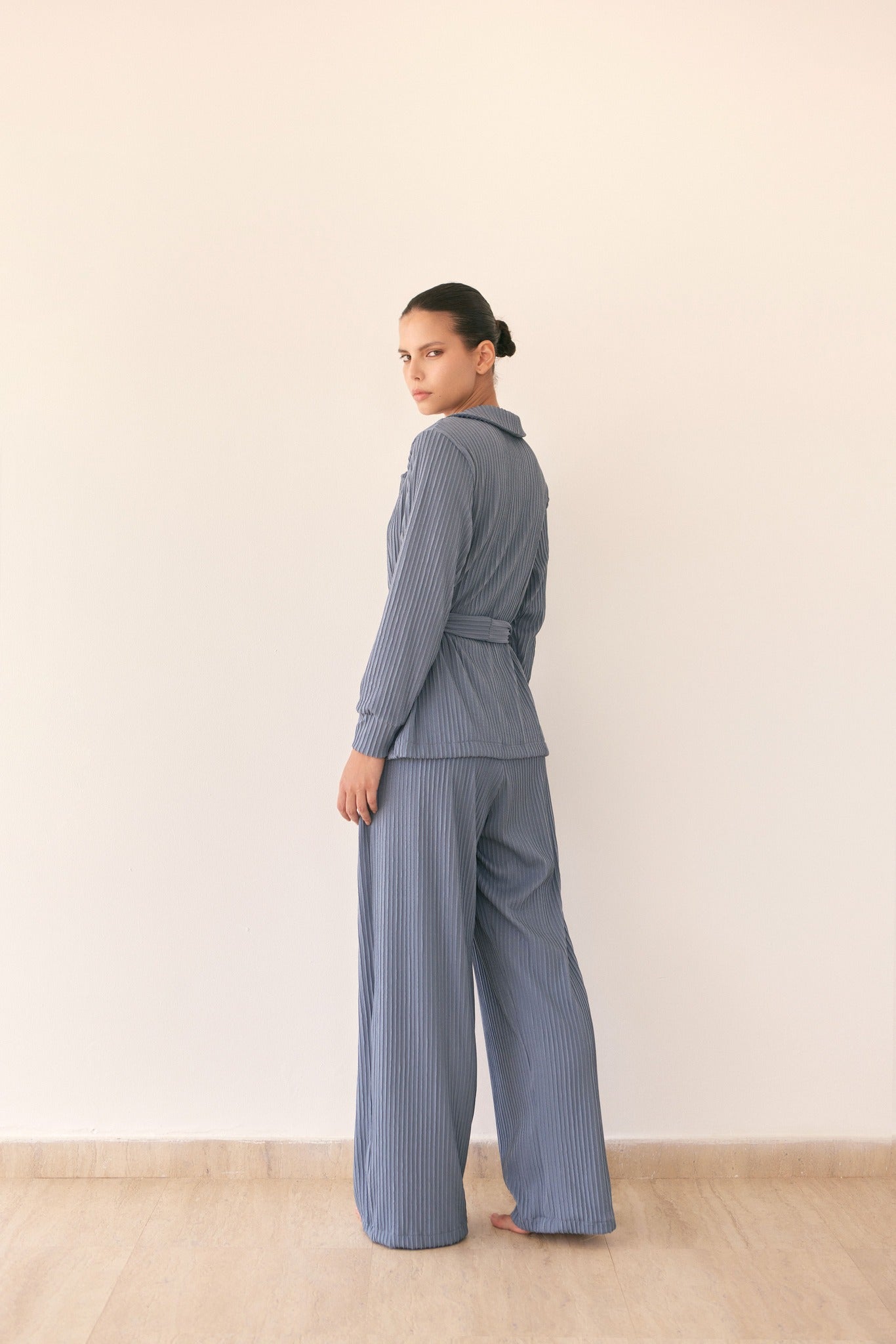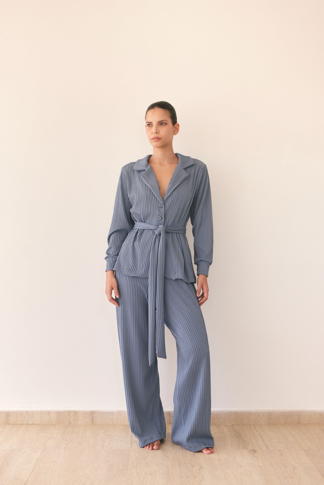 Blue pants and blazer set. The elastic waistband fits the pants perfectly. The blazer can be worn with or without the matching belt for a casual look. Perfect for a ceremony or meeting.