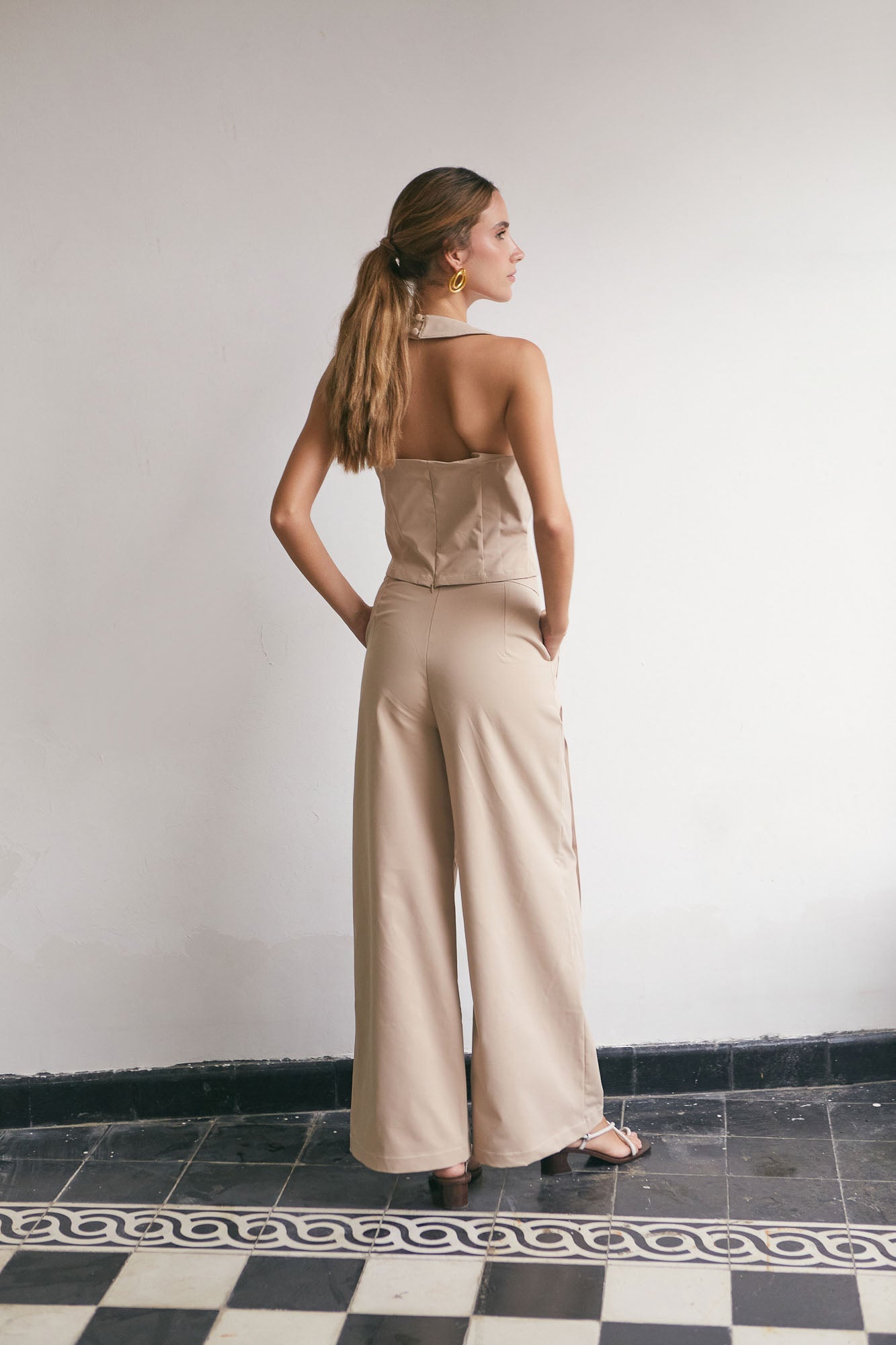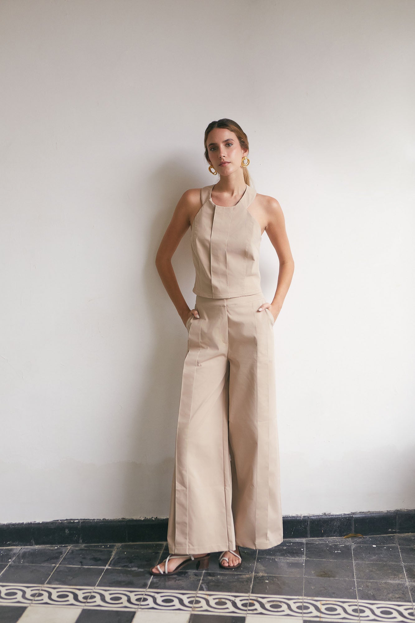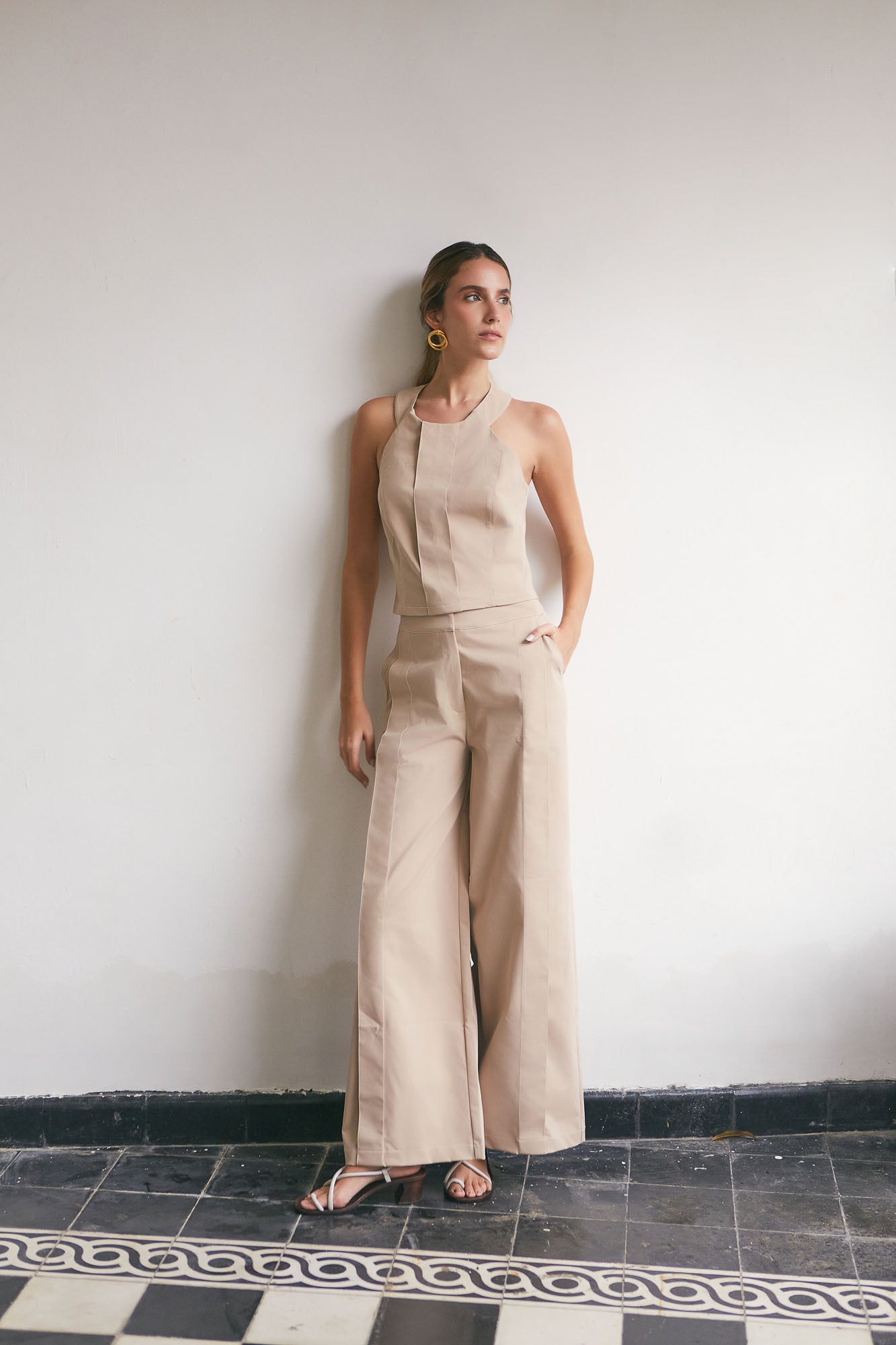 Beige pants and halter top set. It's an outfit that highlights a woman's femininity by having bare shoulders. Because of its color, wear it from morning to night just by changing the accessories and shoes.