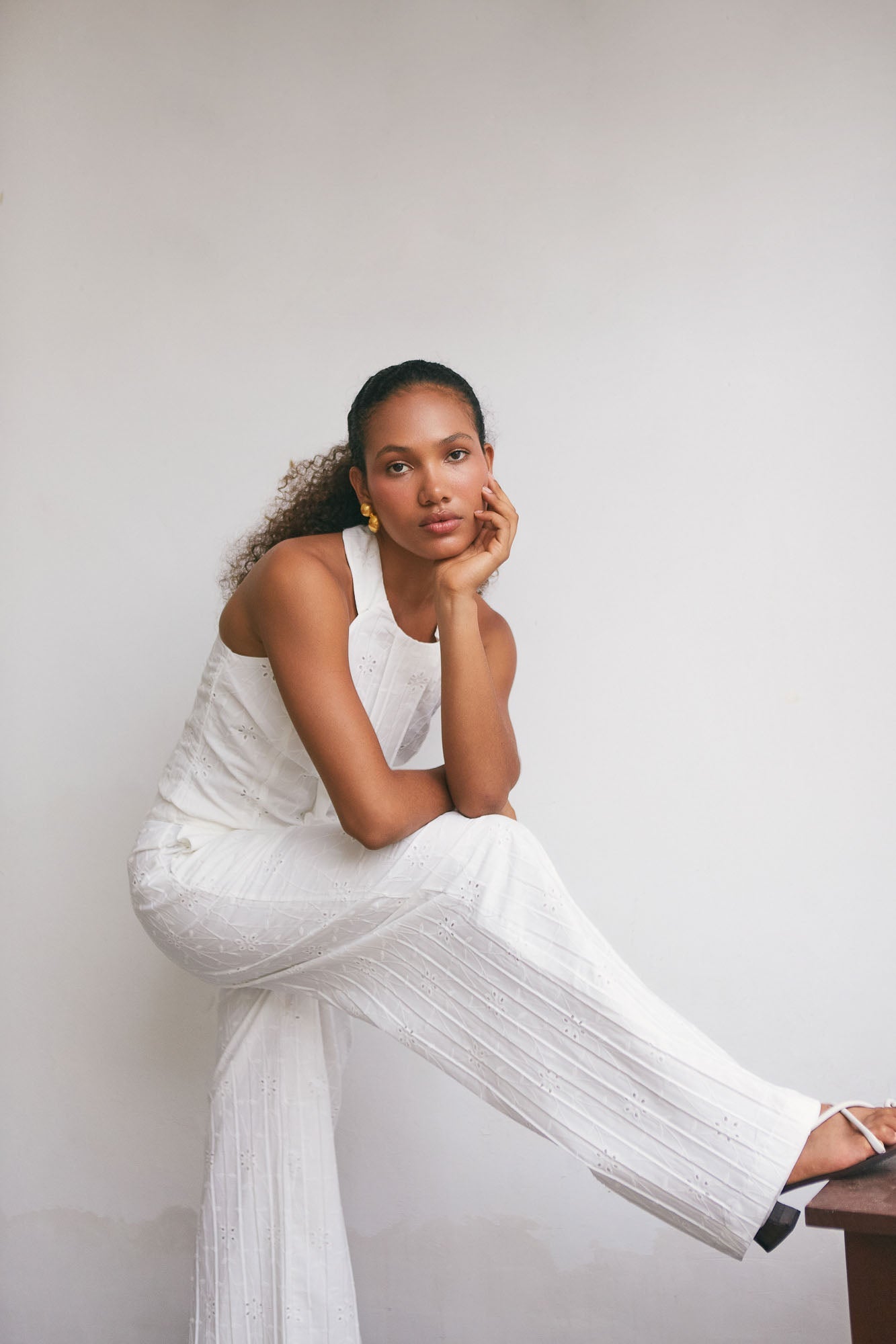 Beige pants and halter top set. It's an outfit that highlights a woman's femininity by having bare shoulders. Because of its color, wear it from morning to night just by changing the accessories and shoes.