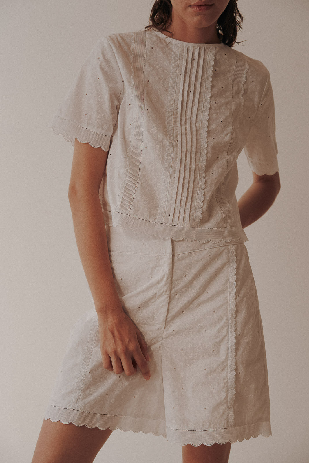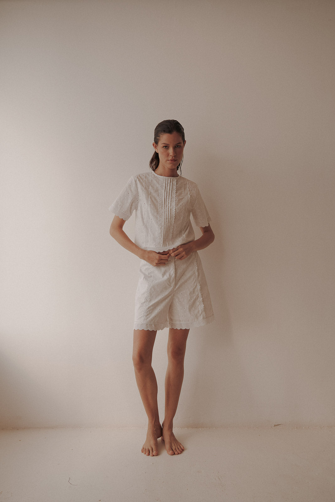 Bermuda and shirt set in eyelet cotton. The lace details throughout give it a romantic and very feminine touch. Perfect for a weekend getaway or an afternoon laze.