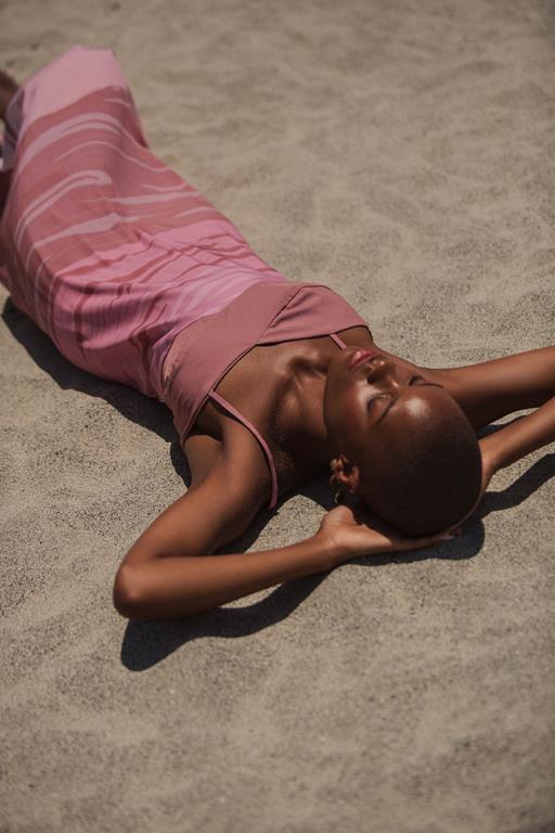 Long printed strappy dress with a low neckline. This dress highlights a woman's silhouette, making her look very feminine. Ideal for wearing with sandals for a walk on summer vacation.