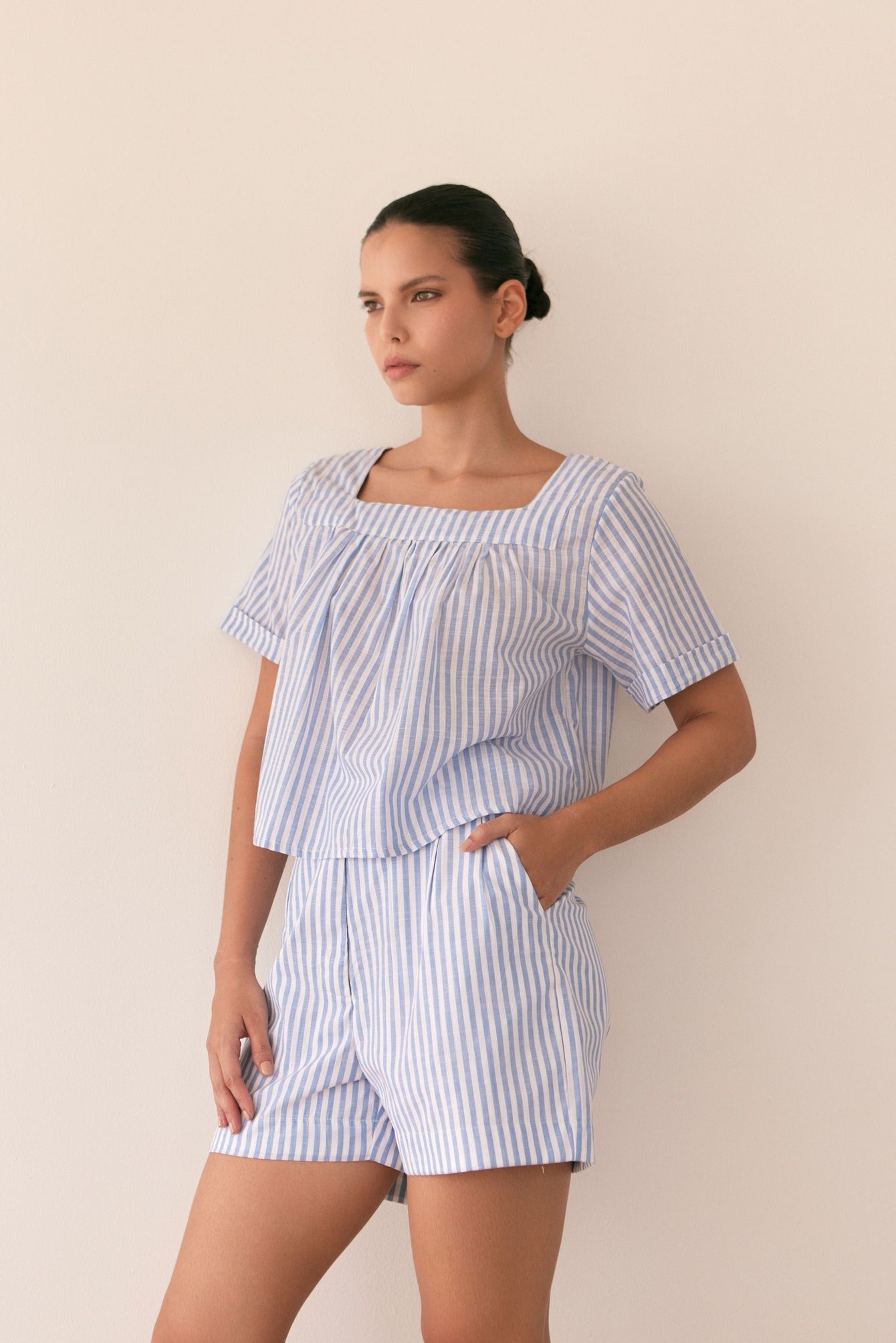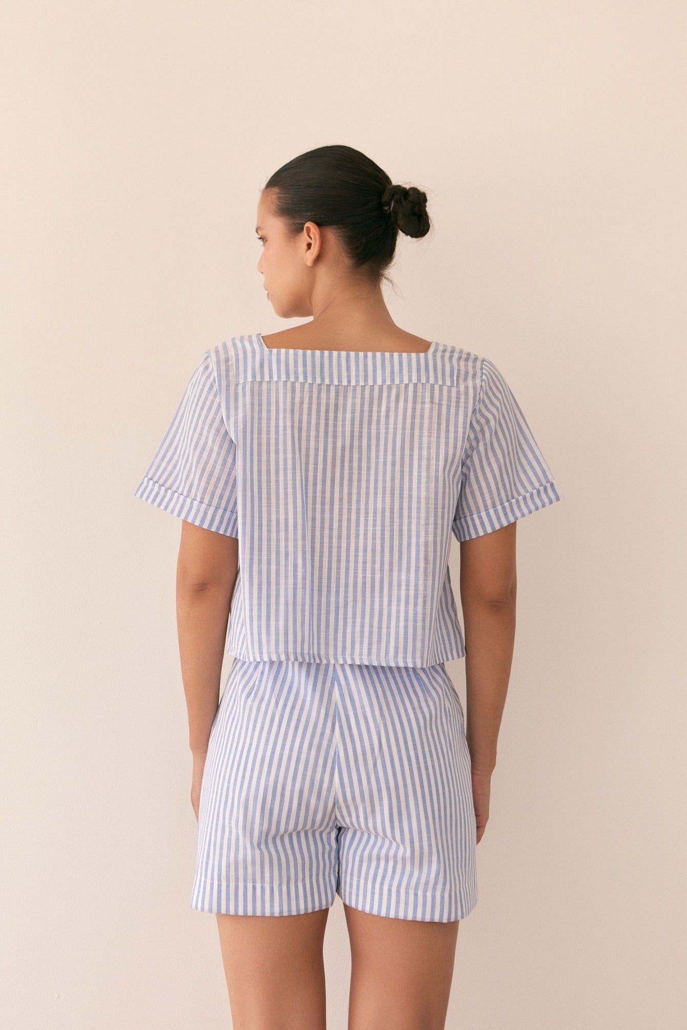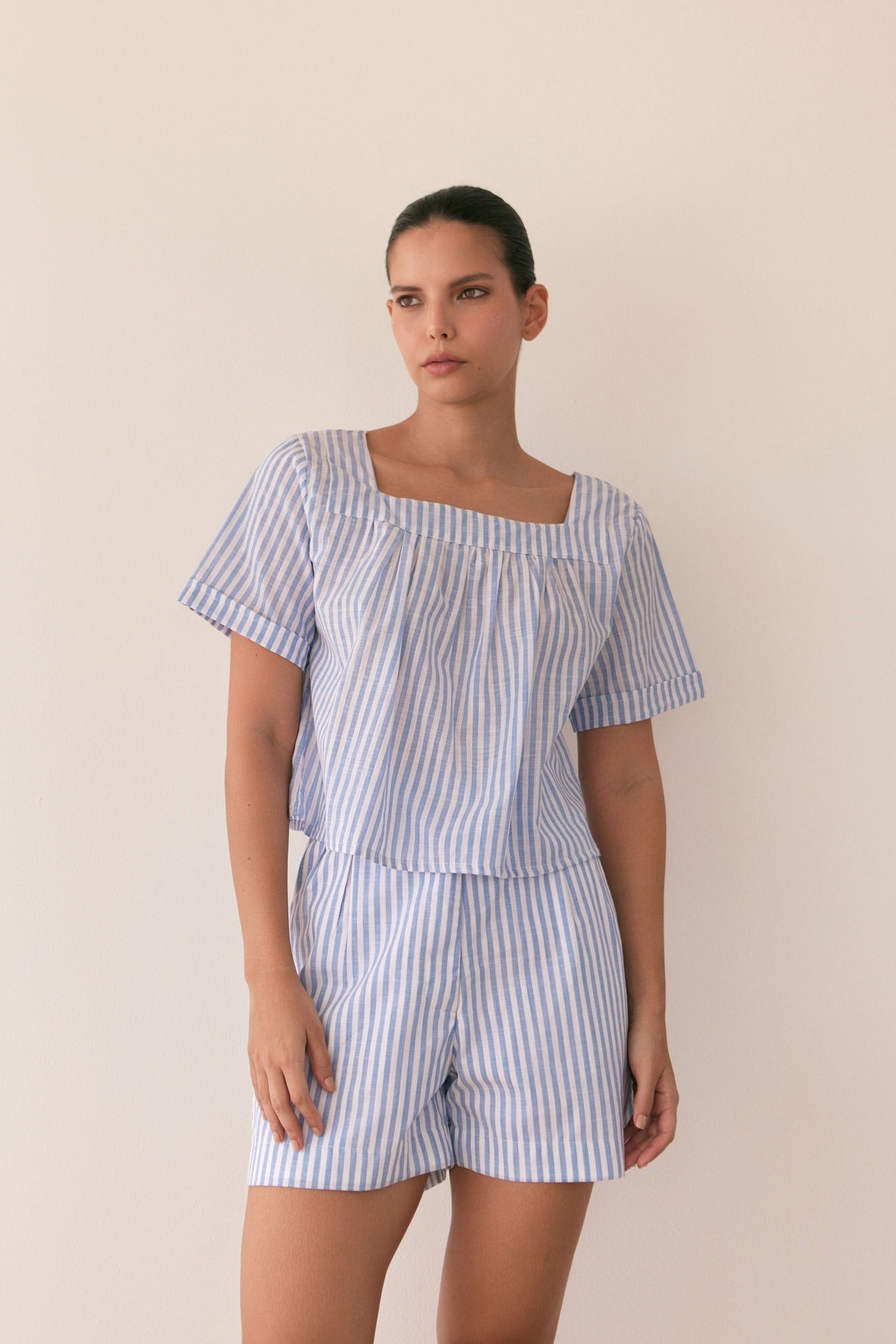 Striped shorts set. High-waisted shorts with an oversized top. This is a comfortable, cool set, perfect for the weekend with sneakers or flats.